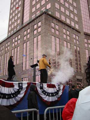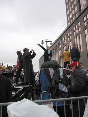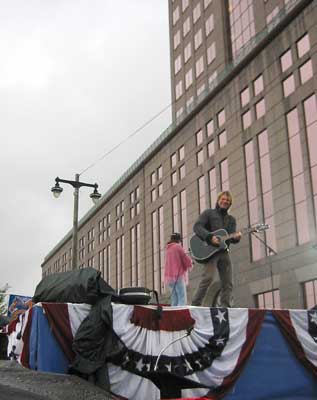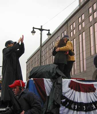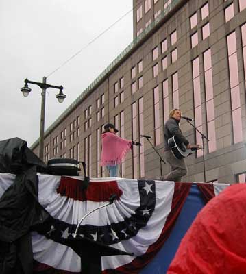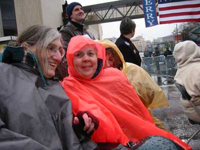 The temperature was a bit on the raw side and it rained steadily the whole time. I adjusted levels using Photoshop, it was actually a lot darker than the photos indicate. The Democrats met outdoors. The Republicans met with President Bush indoors at the Cellular Arena.