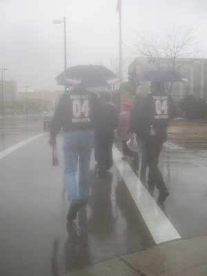 Volunteers went around with towels to tackle the puddles in the seats. That evening when I watched the national news, could see Sally's blaze orange poncho.