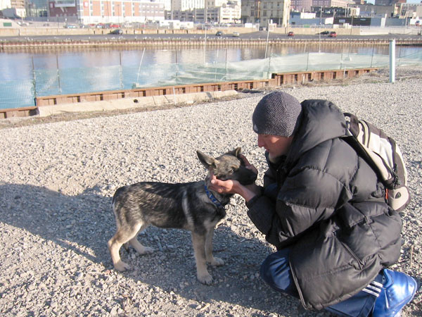 Baby is taking her shift on gull patrol along with the older dogs. This vacant lot by the river is to become a construction site later in the year. Sweet job, getting paid to chase birds! Yes, that is Geoff in a parka and hat, it was cold that day. |