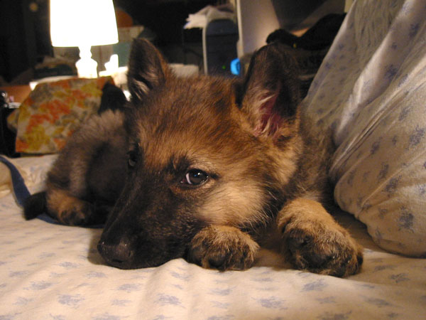 Baby is growing fast and looks a bit different each time I see her. Here she looks like a German shepherd, Rin Tin Tin's little sister? She is still a bit shy, but very alert and loves to play in water. Geoff still carries her in a backpack when he rides his bike, but she is getting better at keeping up. Those stubby little puppy legs are getting longer. |
