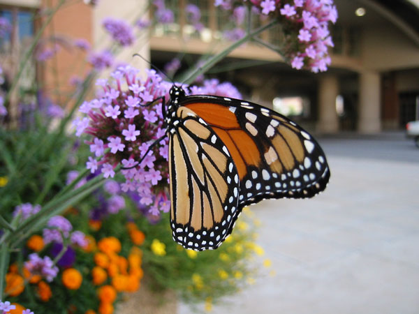 August 26, 2004 - I spotted the butterfly above on the east side of the Midwest Express Center, 4th Street between Wisconsin and Wells. I am not sure what species the plant is, but the butterfly returned several times to sip the nectar. I spotted another one flying on the lower east side in the evening. I found a third one on the sidewalk near MSOE on a cold afternoon at the end of the season. It was near death, wings scuffed. These were the only monarchs I saw besides the ones I raised in captivity. But, between the six individuals, I witnessed the entire life cycle.
