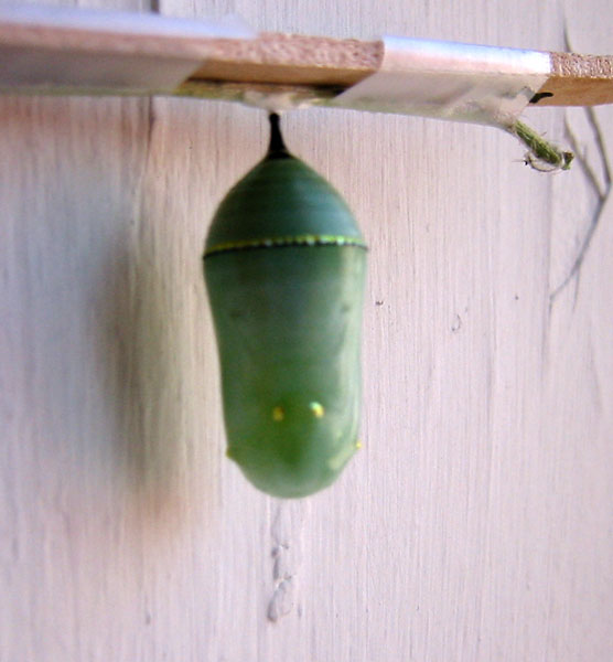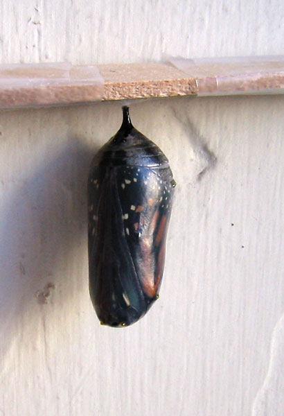 August 19, 2004, 9:09 am - the chrysalis was dark when I got up in the morning with the butterfly's wings visible inside. |