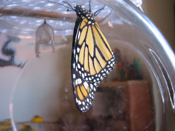 August 19, 2004, 10:35 am - Here she has just emerged, her wings are still soft and limp and her abdomen is distended. She hung from the covering on the opening of the fish bowl and made pumping motions periodically expelled some fluid as her wings took shape and began to harden. |