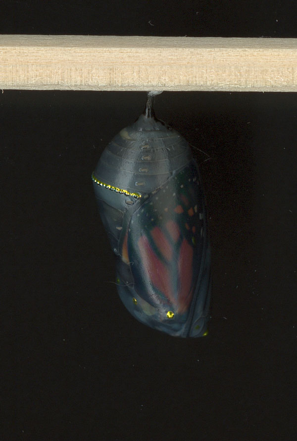 September 11, 2004 - this morning the chrysalis of the second one is very dark and wing coloring is visible clearly. |