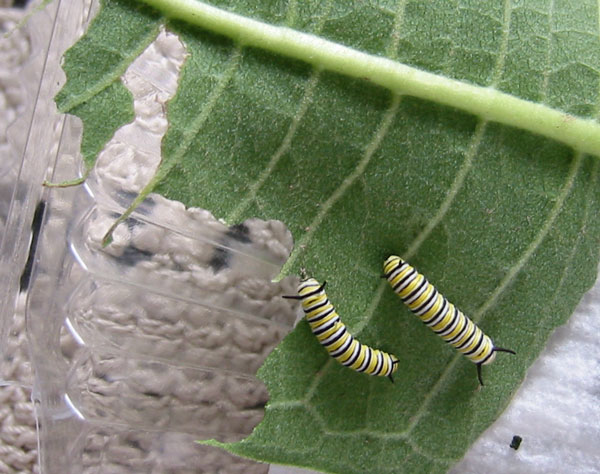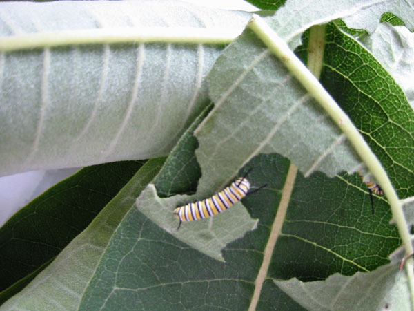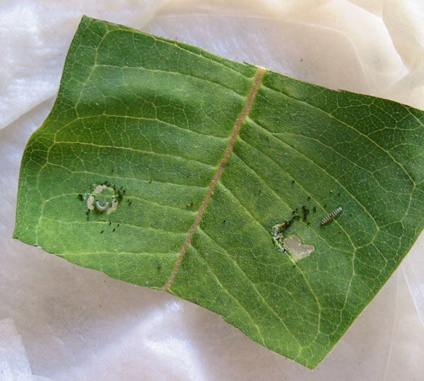 August 22, 2004 - two caterpillars munch on one third of a milkweed leaf. They are probably still near where they hatched. detail showing caterpillar to the left