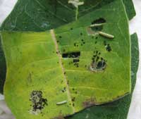 August 25, 2004 - the caterpillars are still working on the half leaf, but are larger and their "whiskers" or "feelers" and characteristic stripes are showing clearly. |