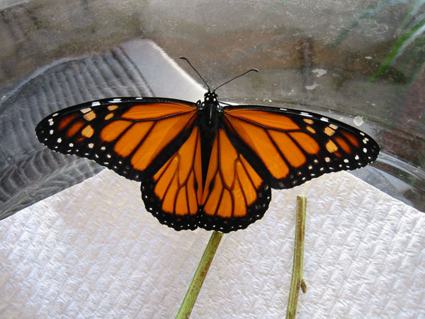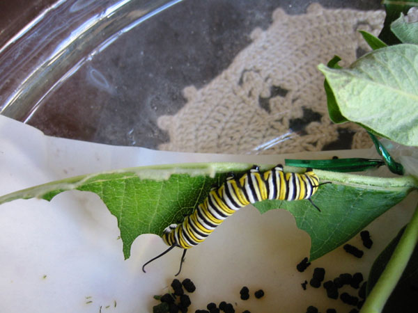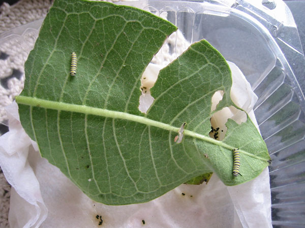 After I released the first butterfly, Kathleen asked if I would be interested in raising some caterpillars. She brought some milkweed leaves with eggs and tiny caterpillars and cut out about the center 1/3 of a leaf with two of them and left several whole leaves to keep in the refrigerator to feed them later. This time I was able to observe the whole life cycle.