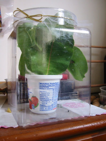 August 24, 2004 - the caterpillars haven't consumed all of the original leaf, but it was turning yellow and showing signs of mold, so I put in a fresh half leaf. When they are small, it is better to let them go to the new leaf on their own to avoid injury. The one caterpillar is decidedly larger than the other. It represents one day's growth! |