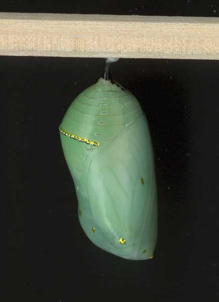 September 9, 2004 - I have been waiting for the metamorphasis. It was difficult to get a clear picture with the camera, but the caterpillar in the fish bowl had attached to a wooden chopstick, so I gently laid it on my scanner to get a better image. The veins of the wings are visible, and the metallic gold spots make it look like a piece of jade jewelry. I find I am missing watching and feeding the caterpillars. |